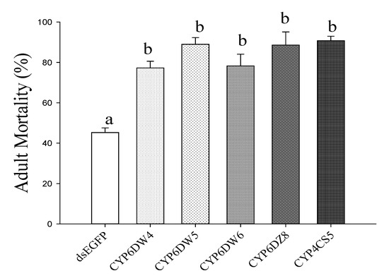 - Yang, X.; Xie, W.; Wang, S.L.; Wu, Q.J.; Pan, H.P.; Li, R.M.; Yang, N.N.; Liu, B.M.; Xu, B.Y.; Zhou, X.M.; et al. Two cytochrome P450 genes are involved in imidacloprid resistance in field populations of the whitefly, Bemisia tabaci, in China. Pestic. Biochem. Physiol. 2013, 107, 343–350. [Google Scholar] [CrossRef]