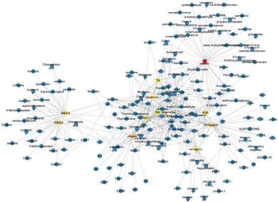 Structural network of the drugs used for Parkinson’s disease treatment, their pharmacological targets, and their representative components. The structural network shows the compounds (yellow nodes) and their pharmacological targets (blue nodes). Nodes represent the compounds and pharmacological targets, and edges indicate the reported interactions among them.