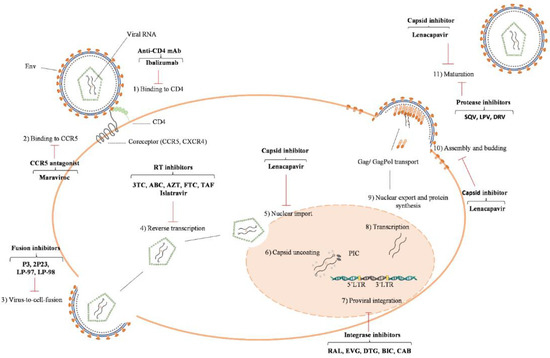 The HIV-2 life cycle and targets for drug intervention. HIV-2 infection begins with the binding of envelope glycoprotein (Env) spikes to receptors on the surface of a CD4 cell (step 1) and to a membrane-spanning co-receptor (e.g., CCR5) (step 2). This process can be disrupted by binding (CD4 binding antibody, Ibalizumab) and entry inhibitors (CCR5 antagonist, Maraviroc). Fusion of the viral and cellular membranes allows the viral particle to enter the cell (step 3). Fusion inhibitors (helical domain 1 binding peptides such as P3, 2P3, LP-97 and LP-98) can be used to block viral fusion and entry. Inside the cell, HIV reverse transcriptase converts genomic RNA into DNA, which is released into the nucleus within the pre-integration complex (PIC) following nuclear import of the capsid (step 5) and capsid uncoating (step 6). The reverse transcription process can be blocked using reverse transcriptase inhibitors (3TC, ABC, AZT, FTC, TDF, TAF). Once in the nucleus, HIV DNA is integrated into the cell’s genome using the enzyme integrase (step 7). HIV DNA integration can be inhibited using integrase strand transfer inhibitors (RAL, EVG, DTG, BIC, CAB). New HIV mRNA is transcribed (step 8) and transported into the cell cytosol (step 9). The mRNA serves as a template for HIV protein synthesis (Gag/Gag-Pol polyproteins, envelope glycoproteins, accessory proteins) and as full-length genomic RNA. These molecules are transported to the cell surface to be incorporated into new viral particles. Viral particle budding, release and capsid maturation are the final steps in the HIV life cycle (steps 10 and 11). The HIV protease enzyme cleaves the Gag/Gag-Pol polyproteins, resulting in the mature capsid and fully infectious viruses. Protease inhibitors (DRV, LPV and SQV) bind to the HIV-2 protease enzyme and interfere with the maturation step of the virus. Lenacapavir is a capsid inhibitor that acts at multiple steps in the HIV replication cycle. The sites of action of clinical inhibitors (red line) are shown.