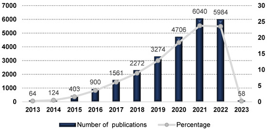 Number of publications and percentages per year covering ICIs in cancer topics, period 2013–2023. Data source from Web of Science™ Core Collection.