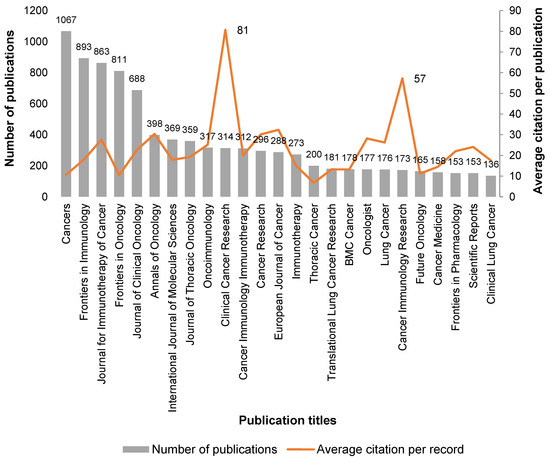 The four most-published journals are all open access, namely Cancers from MDPI, Frontiers in Immunology and Frontiers in Oncology from Frontiers and Journal for Immunotherapy of Cancer from Society for Immunotherapy of Cancer (SITC) (Figure 2), which also contributed to the wide dissemination of this subject. The first generalist journal to appear is the International Journal of Molecular Sciences (IJMS) of the MDPI publisher; in positions 23rd and 24th are Frontiers in Pharmacology (Frontiers publisher) and Scientific Reports (Nature publisher), respectively (see Figure 2). Although we perceive that, in general, older publications accumulate more citations, and the publications analyzed in this theme are mostly very recent (representing 94% in the period of 2017–2022), there are clearly two journals that stand out with numbers of citations per publication of 81 and 57 for Clinical Cancer Research and Cancer Immunology Research, respectively (see Figure 2). Interestingly, these two most-cited journals are both from the American Association for Cancer Research publisher.
