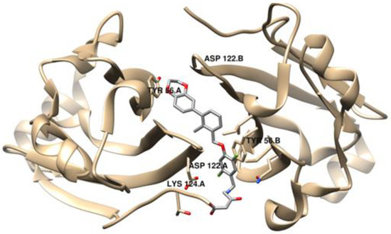 Small molecule-based immunotherapies, compared to peptide- and especially Ab-based therapies, offer advantages such as a higher oral bioavailability, overall lower costs and a relative shorter half-life, which leads to less potential toxicity and adverse effects [51]. However, despite the pharmacokinetic benefits, small molecules have been receiving limited attention, probably due to the intrinsic difficulty of mimicking conventionally complex protein–protein interactions (PPIs) [52]. It was only recently that small molecules started receiving attention, taking on a more relevant role in immune checkpoint therapies, especially as inhibitors of the PD-1/PD-L1 interaction. This late and complex investigation might be due to the PD-1/PD-L1 large binding interface, spanning ~1970 Å2, devoid of well-defined binding pockets [53]. The first small molecules with a promising inhibitory activity against PD-L1, a series of compounds containing a biphenyl group, were disclosed by Bristol-Myers Squibb (BMS) in 2015 [54]. However, the binding mechanism was found by Holak’s group, who discovered that the BMS compounds induced the dimerization of the PD-L1 protein. The unveiling of two co-crystal structures of PD-L1 in complex with small molecule inhibitors, BMS-202 (19) and BMS-200 (20) (PDB ID: 5N2F and PDB ID: 5J89, respectively), brought light to structure-based drug design [55,56]. Mittal et al. [57] applied molecular docking studies to a PD-1/PD-L1 complex with BMS inhibitors against the PD-L1 protein and discovered that the residues Tyr56, Asp122 and Lys124 play crucial roles in ligand binding to the PD-L1 protein (Figure 4), an important piece of information for the design of inhibitors of PD-L1. These findings also led to the development of different molecules containing a biaryl moiety, following a ligand-based approach.