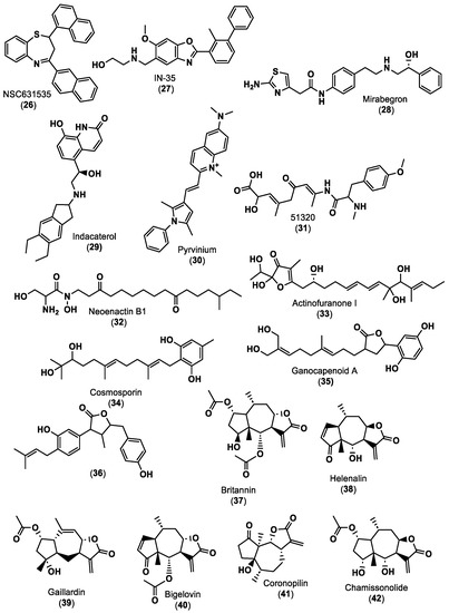 In 2022, DiFrancesco and co-workers [51] began a high-throughput virtual screening of approximately 3.7 million lead-like molecules from the ZINC online repository using a rigid-receptor docking approach against both human PD-1 and PD-L1. This first step showed possible small molecule tractability of only the PD-1 binding. This lead-like dataset followed, as criteria, a molecular weight between ≥250 and ≤350 g/mol, an XlogP value ≤3.5 and a number of rotatable bonds ≤7. The next step involved molecular docking of the National Cancer Institute (NCI) compound dataset only against the PD-1 binding pocket. The top ~0.1–5% of molecules obtained from both datasets were clustered into separate bins using the ChemMine server binning tools. Considering the cost, commercial availability and binding to key residues of PD-1 and PD-L1, 40 top hit compounds were selected. The dynamic binding performance of these compounds was further investigated using long 100 ns MD simulation with the Desmond Molecular Dynamics package. Despite its low molecular weight (415.5 g/mol), compound NSC631535 (26) in Figure 6 reveals itself to be a potentially stable binder at the PD-1 interface pocket, exhibiting an experimental IC50 of 15 µM.