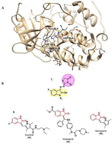 (A) 3D interactions of sunitinib with CDK2 (PDB code: 3Ti1) using UCSF Chimera [58,84]. (B) 1. Structure of the designed hybridized molecules. 2. 2-indolinone pharmacophore motifs in CDK2 inhibitor commercially marketed drugs [58,84].
