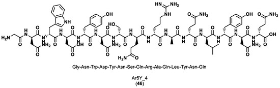 The scaffold library was built by extracting scaffold fragments from 22,912 protein crystal structures in the PDB. The key PD-L1 anchor residues, Tyr56, Arg113, Ala121, Asp122 and Tyr123, were identified using three prediction tools, Robetta, KFC2 and PredHS, with the PD-1/PD-L1 complex (PDB ID 4ZQK) as the input structure. Scaffold screening was performed by superposing each fragment from the library onto the anchor residues using the Cealign algorithm in the Pymol program. The scaffold fragments with a root-mean-square deviation (RMSD) inferior to 2.0 Å were kept for the next step. Since one scaffold was unable to accommodate all five key residues due to their relative positions and structural properties, two scaffold fragments were selected. To transform the two scaffolds into a continuous peptide, Rosetta module Kinematic loop modeling was applied, and the optimization of the sequence design and structure minimization was performed employing the Backrub module. Finally, the resulting peptides in complex with PD-1 were enhanced using Rosetta’s Relax module and scored using the InterfaceAnalyzer module of Rosetta. The most potent peptide, Ar5Y_4 (46), as seen in Figure 8, showed a KD value of 1.38 ± 0.39 μM, comparable to the binding affinity of the cognate PD-L1.