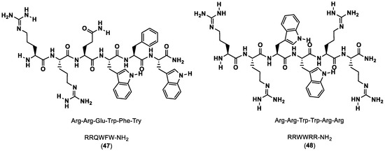 Li and co-workers [90] described an in silico virtual screening and biomolecular interaction analysis (BIAcore) against an internal peptide library to discover novel PD-1/PD-L1 inhibitor peptides. Screening was performed using molecular docking and RRQWFW-NH2 (47) and RRWWRR-NH2 (48), which were found to have the best docking scores, as shown in Figure 9. Next, MD simulations and surface plasmon resonance (SPR) were used to further corroborate their predictions. The in vitro studies were consistent with the computational data, providing some insight on new candidate peptide drugs for cancer immunotherapy.
