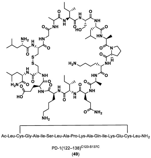 PD-1(122–138) C123-S137C (49) in Figure 10 has been shown to have the best inhibitory activity, so its 3D NMR structure was established and the binding site to PD-L1 was determined using molecular modeling methods. These results showed that the peptides synthetized are able to mimic the PD-1 interactions and block the PD-1/PD-L1 interaction.