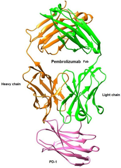 In this context, Tavares et al. [97,98] investigated in silico, by employing quantum chemistry methods based on the Density Functional Theory (DFT), the binding energy features of the receptor PD-1 in complex with pembrolizumab, an FDA-approved Ab for advanced melanoma (see Figure 11). Their computational findings allowed for a greater knowledge of the binding mechanisms, helping in the development of better Ab-based drugs or even small molecules.