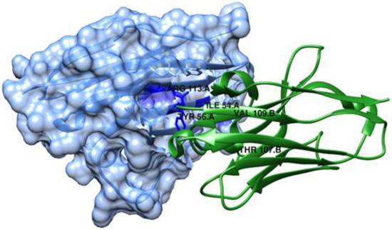 Wen et al. [99] also studied the binding mechanism of Abs against PD-L1. They used the computational alanine scanning method (MM/GB/ASIE method) to calculate residue-specific binding energy contributions for five systems: PD-L1/KN035 (Figure 12), PD-L1/atezolizumab, PD-L1/avelumab, PD-L1/durvalumab and PD-L1/BMS-936559 (PDB IDs: 5JDS, 5XXM, 5GRJ, 5X8M and 5GGT, respectively). Their hotspots were predicted, and their results showed that PD-L1 Met115 and PD-L1 Tyr123 are important hotspots for all five complexes. In addition, it also showed that the crucial mAbs residues binding to PD-L1 Met115 and PD-L1 Tyr123 are very similar to each other. The experimental measurements available for KN035 and atezolizumab are in agreement with the computational results, with a correlation coefficient of 0.87 for PD-L1/KN035 and 0.6 for PD-L1/atezolizumab. The computational results also found more interactions on PD-L1/KN035, which is also in agreement with the experimental results.