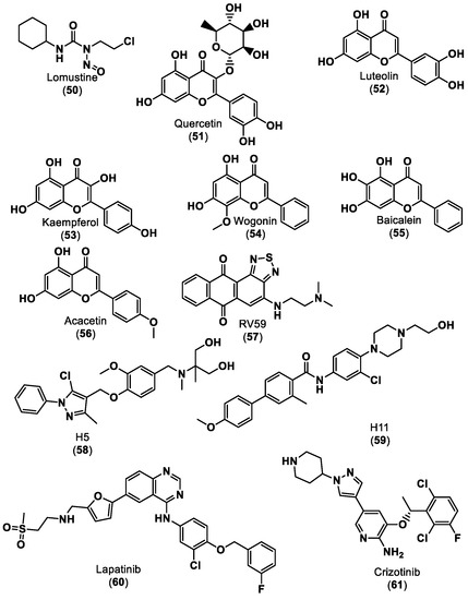 Several small molecules targeting the PD-1/PD-L1 interaction have been identified in the last years, some of them comprising moieties such as urea (e.g., CA-170 (1)), guanidine (e.g., abemaciclib (4), ciforadenant (6), 6-thio-2′-deoxyguanosine (10), SF1126 (15)), sulfone (e.g., navtemadlin (3), vismodegib (11)), biphenyl (e.g., INCB086550 (5)) and N-heterocycle (e.g., tomivosertib (2), pexidantinib (9), carbozanitinib (12), cediranib and olaparib (13), itacitinib (14), sitravatinib (16), talazopanib (17), apatinib (18)), which are already in the clinical phases (Table 1 and Figure 3). However, the clinical results of targeting multiple immune-related targets still need to be elucidated; therefore, some works have recently been reported to identify small molecule targets using computational approaches in this regard [101,102,103]. Zhang et al. [101] reported using the PharmMapper database [104] to identify the targets of the small molecule lomustine (a nitrosourea derivative, 50), which is investigated for the treatment of primary glioblastoma (see Figure 13). Pan et al. [102] used the BATMAN-TCM web tool [105] to identify 288 targets and 53 bioactive compounds from Qingfei Jiedu decoction (QFJDD, an empirical Chinese prescription prepared from several herbals) that regulates PD-L1 expression in lung adenocarcinoma (LUAD). In the end, six flavonoid derivatives, including quercetin (51), luteolin (52), kaempferol (53), wogonin (54), baicalein (55) and acacetin (56), and 22 hub genes were identified (Figure 13). Huang et al. [103] reported the use of PASS web resources for the validation of MYC/CXCL8 (C-X-C motif chemokine ligand 8)/TIMP1 (TIMP metallopeptidase inhibitor 1) oncogenes, which regulate immune response in an antitumor direction by mediating PD-L1, as potential drug targets for RV59 (57), an anthraquinone derivative with anticancer activity against NCI human colon cancer cell lines (Figure 13). Mittal et al. [57] developed an in silico structure-driven approach to screen and classify small molecules from the Asinex Signature library for the investigation of the inhibition of the PPIs between PD-L1 and PD-1/CD80 and its overexpression on cancer cells. In the end, two molecules, H5 (58) and H12 (59), were proposed as ICIs (Figure 13). The intersection between the two predicted targets, lomustine (50) and glioblastoma-related targets, was 59 active targets [101]. PPI, gene enrichment analysis, gene difference analysis, molecular docking and MD simulation have been used by the authors to screen out three effective targets of lomustine (50): HMOX1 (heme oxygenase 1), AKT1(AKT serine/threonine kinase 1) and EGFR (epidermal growth factor receptor) [101]. The same target, EGFR, was proposed by a different approach for QFJDD bioactive compounds (51–56) through a network construction and analysis comprising PPI, GO, KEGG and DAVID pathway analyses and molecular docking [102]. Several selected targets were associated with numerous human cancers, e.g., AKT1 [101], EGFR [101,102], HIF-1 (hypoxia inducible factor 1 subunit alpha) [102], MYC [103] and CXCL8 [103]. Furthermore, some of the selected targets seem to be related to an inflammatory response (CXCL8 [103]) or responses to viral infection (JUN [102], NFκB [102], and CD80 [57]).