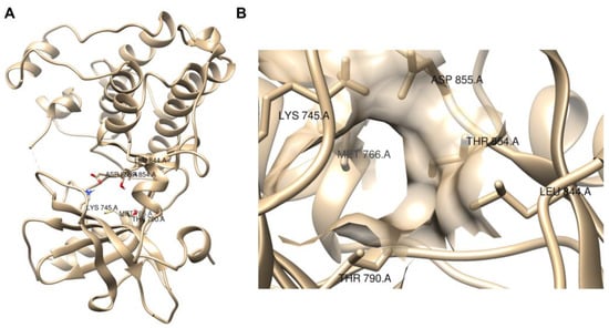 Visualization of EGFR protein (PDB, ID 3W2S) with UCSF Chimera [58]. (A) Full view; (B) binding active pocket region [101,102].