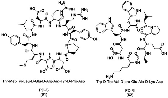 Guardiola et al. [110] reported the exploitation of the computational power of the Rosetta modeling suite (https://www.rosettacommons.org/software (accessed on 28 February 2023)) in terms of large-scale backbone sampling (Monte Carlo simulations), side-chain composition and energy scoring to design heterochiral cyclic peptides that bind to a protein surface of PD-1. The authors designed a library of seven cyclic peptides (PD-i1- PD-i7) from those two peptides, PD-i3 (61) and PD-i6 (62). PD-i3 and PD-i6 showed mid-micromolar binding affinity to the target PD-1 and outcompeted endogenous PD-1 ligands for disrupting the PD-1/PD-L1 interaction, as shown in Figure 15.