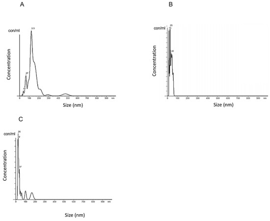 The size profile of sEVs was in the range of 40–130 nm, while the highest concentration of the isolated particles had a size of 123 nm (Figure 2A). The average particle size was 150 nm. The particle concentration was 0.88 × 108 particles/mL of plasma. The size profile of the sEVs isolated from DNase-treated plasma (Dplas-sEVs) particles is in the range of 16–40 nm, while in the highest concentration in the isolated samples, there are particles with a size of 28 nm (Figure 2B). The average particle size is 36 nm. The concentration of particles is 3.55 × 1012 particles/mL plasma. The resulting size profile of sEVs treated with DNase (D-sEVs) is in the range of 22–37 nm, while in the highest concentration in the isolated samples, there are particles with a size of 26 nm (Figure 2C). The average particle size is 62 nm. The concentration of particles is 2.76 × 1012 particles/mL plasma.