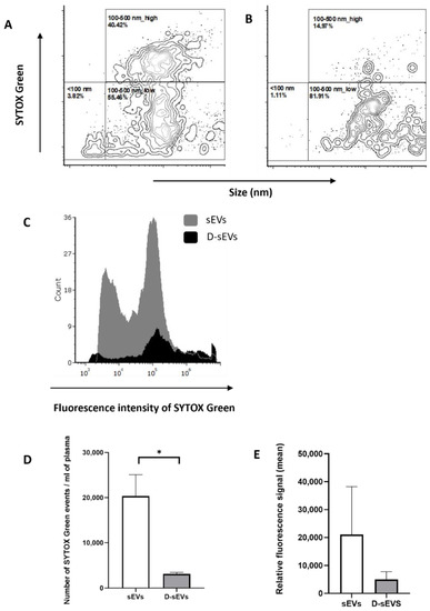 Flow cytometry of sEVs. (A) sEVs isolated from fresh human plasma without DNase; (B) Dplas-sEVs–sEVs isolated from fresh human plasma with the addition of DNase; (C) overlay histogram of sEVs isolated from fresh human plasma with and without DNase; (D) number of detected events per ml of plasma; (E) relative fluorescence signal of ecDNA stained with SytoxGreen. Data are shown as the mean ± SEM. Significance was assumed at p < 0.05. * p < 0.05. sEVs–EVs isolated from fresh human plasma without DNase; D-sEVs–sEVs treated with DNase.