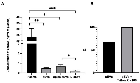 EcDNA in plasma and sEVs. (A) Quantification of ecDNA in plasma and sEVs. (B) Percentage of ecDNA outside of sEVs. Percentage shows the average concentration of DNA. sEVs–sEVs isolated from non-treated plasma, Dplas-sEVs–sEVs isolated from DNase-treated plasma and D-sEVs–sEVs treated with DNase. * p ≤ 0.05; ** p ≤ 0.01; *** p ≤ 0.001; data are shown as the mean ± SEM.