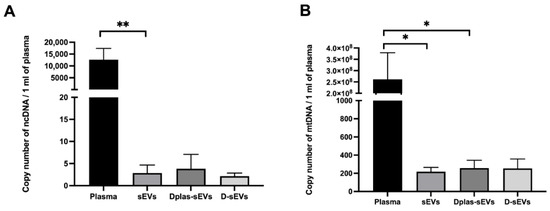 Number of DNA copies/mL of plasma in plasma and sEVs. (A) Nuclear DNA; (B) mitochondrial DNA. sEVs–exosomes isolated from DNase non-treated plasma. Dplas-sEVs–sEVs isolated from DNase-treated plasma. D-sEVs–sEVs treated with DNase. * p ≤ 0.05; ** p < 0.01.