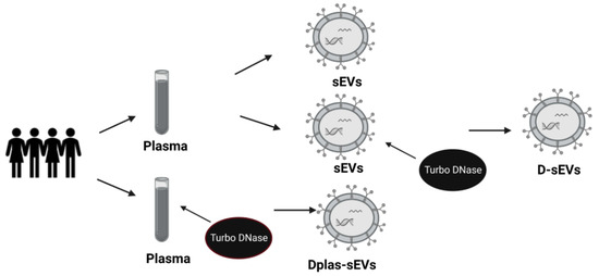 Scheme of sEVs samples. sEVs—small extracellular vesicles from DNase-free plasma; Dplas-sEVs—sEVs from Dnase–treated plasma; D-sEVs—sEVs treated with Dnase.