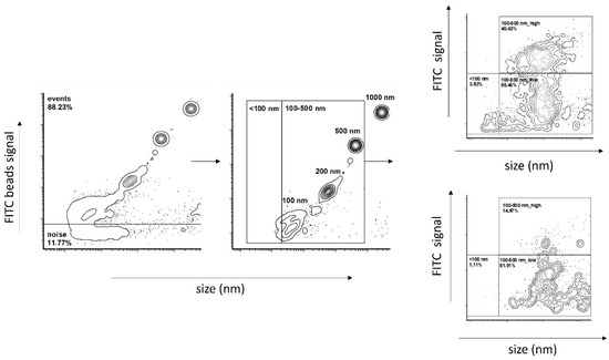 Flow cytometry (FC) was performed using a Dx FLEX Flow Cytometer (Beckman Coulter Inc., Brea, CA, USA). FC was pre-calibrated using calibration beads of sizes of 100 nm, 200 nm, 500 nm and 1000 nm. The gating strategy was used as follows: all events were plotted using a V-SSC-H channel on an x-axis and an FITC-A channel on a y-axis. Signal noise was excluded based on the Flow Cytometry Sub-Micron Sizer Reference Kit and Green Fluorescent beads (cat. Number F13839, Thermo Fisher, Waltham, MA, USA) by the selection of events with fluorescence ≥100 nm FITC-labeled beads. Particular size gates were then set up according to 100 nm, 200 nm and 500 nm bead populations and further verified by creating a calibration curve from the V-SSC-H median of the corresponding population. The high- and low-fluorescent vesicles population was gated based on the profile displayed on a representative plot (Figure 8). The samples were diluted in filtered 0.9% NaCl and divided into aliquots. All aliquots were stained with 2 µM Sytox Green Nucleic Acid Stain (Invitrogen, Waltham, MA, USA). The first aliquot was left as the control, and the second was treated first with TURBO™ DNase (2 U/μL) (TURBO DNA-free™ Kit, Thermo Fisher Scientific, Waltham, MA, USA) according to the manufacturer’s recommendation. All samples were incubated for 30 min in the dark at room temperature. The samples were excited by a 488 nm laser, collected on a 525/40 BP filter and measured for one minute at a slow flow rate (10 μL/min).