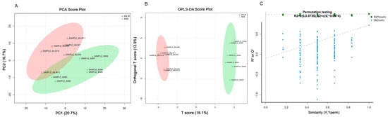 Principal component analysis (PCA) was performed using MetaboAnalyst 5.0 (https://www.metaboanalyst.ca/, accessed on 16 November 2022). Orthogonal projections to latent structures discrimination analysis (OPLS-DA) and variable importance in projection (VIP) values were generated using MetaboAnalyst R. Fisher’s exact test was applied to identify the significant KEGG pathways, p-value ≤ 0.05.