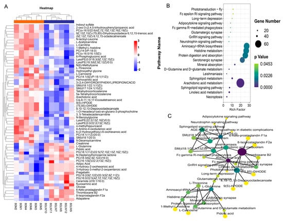 Quantitative metabolomics of LW and M pig serum samples. (A) Hierarchical clustering based on differential metabolites in the serum of LW and M pigs. The differentially expressed metabolites (DEMs) were identified with a VIP > 1 and p-value ≤ 0.05. Significantly altered metabolites are highlighted in red (increased) and blue (decreased); (B) Kyoto encyclopedia of genes and genomes (KEGG) pathway enrichment analysis of DEMs; (C) KEGG network diagram. The number of metabolites enriched into the pathway determines the node size, and the p-value determines the node color.