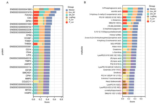Identification of high-confidence biomarkers for predicting adaptive immune differences between pig breeds. (A) Top 30 ensemble feature selection (EFS) proteins (LW versus M); (B) Top 30 EFS metabolites (LW versus M).