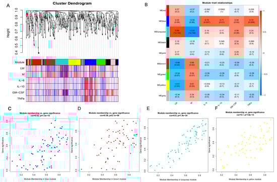 Weighted gene correlation network analysis (WGCNA) of all metabolites identified from different pig breeds. (A) Module clustering tree; (B) Phenotypic and modular correlation diagrams; (C–F) A scatterplot of gene significance (GS) vs. module membership (MM) in the four modules that showed the closest relationship with phenotypes.