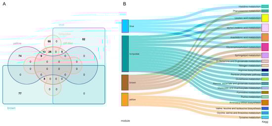 KEGG pathway enrichment analysis of four module metabolites. (A) Venn diagram of differential metabolites within the four modules; (B) KEGG enrichment analysis of four modular metabolites.