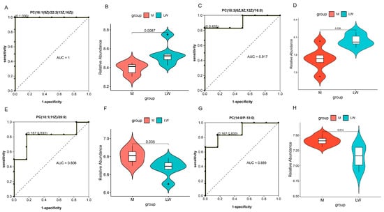 Receiver operating characteristic (ROC) curves and expression abundance of critical metabolites. (A,C,E,G) ROC curve for 4 key metabolites and (B,D,F,H) expression abundance of four metabolites in the serum of M pigs and LW pigs; red represents M pig, and blue represents LW pig.