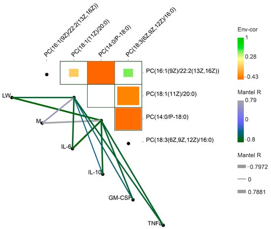 Metabolic reprogramming plays an essential role in the development and activation of immune cells in response to pathogen challenges or environmental changes []. Emerging evidence suggests a key role of metabolic regulation in cytokine release [,,]. Research shows that lipopolysaccharide (LPS) induces the release of succinate in macrophages, which further induces IL-1β production in an autocrine manner []. Dietary supplementation with alpha-ketoglutaric acid induces the production of IL10, which inhibits chronic inflammation and extends life span []. Extensive studies have proved that metabolites and pro-inflammatory cytokines are inextricably linked. In our previous study, cytokines IL6, IL10, TNFα, and GM-CSF were highly expressed in LW pigs. Thus, we used all metabolites supplemented with cytokines and pig breeds as phenotypes to construct WGCNA and to further infer the potential relationship between metabolites and differences in immunity between different pig breeds. Among the nine modules, a total of four significant correlation modules were identified. The blue module metabolites were significantly correlated with four cytokines, indicating a special relationship and the importance of these metabolites in immunity. Combined with differential metabolite analysis, we identified the metabolite subsets responsible for the differences in pig breed immunity. A KEGG enrichment analysis of these differential metabolites showed that these metabolites were generally involved in lipid metabolism-related pathways. In particular, the metabolites PC(18:1(11Z)/20:0), PC(14:0/P-18:0), PC(18:3(6Z,9Z,12Z)/16:0), and PC(16:1(9Z)/22:2(13Z,16Z)) participate in linoleic acid (LA), alpha-linolenic acid (ALA), arachidonic acid (AA), and glycerophospholipid metabolism pathways, suggesting that these four key metabolites have potential predictive roles in distinguishing immunity differences between pig breeds.