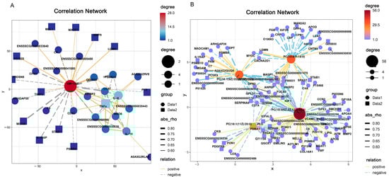 The metabolite data in the core module was uploaded to the search tool STRING (http://string-db.org, accessed on 11 November 2022) to search for interacting genes/proteins. The node and edge information exported as a .txt file and visualized using Cytoscape software (http://cytoscape.org/, version 3.7.2, accessed on 11 November 2022). The cytoHubba plugin was used to analyze degree scores, and the metabolites with the highest score were used to build the PPI sub-network.