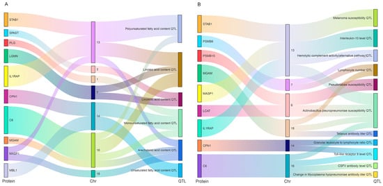 In-depth analysis of potential biological functions of 15 key proteins based on pig quantitative trait locus (QTL) data and protein co-localization analysis. (A) The intersection of 15 key proteins with polyunsaturated fatty acid-related QTL data; (B) The intersection of 15 key proteins with pig immunity-related QTL data.