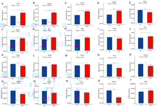 Quantification validation of proteins by parallel reaction monitoring (PRM). (A–T) Quantitative results of PRM for some differential proteins. p-value ≥ 0.05: no marks; p-value ≤ 0.05: *; p-value ≤ 0.01: **; p-value ≤ 0.001: ***; p-value ≤ 0.0001: ****.