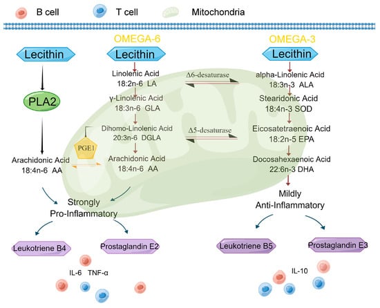 Phosphatidylcholine (PC), also named lecithin, is a lipid class of fundamental biological importance, constituting the major structural component of cellular membranes and as a precursor that mediates essential fatty acid metabolism. Phospholipase A2 (PLA2) mediates the hydrolysis of phosphatidylcholine at the Sn -2 position on the phospholipid backbone and is involved in the metabolism of omega-3 and omega-6, also directly yielding a free AA molecule in one single step []. At present, there are few reports about lecithin being directly involved in disease or the immune response. Phosphatidylcholine is often used as an important precursor in the metabolism of lysophosphatidylcholine (Lyso PC), sphingomyelin (SM), and polyunsaturated fatty acids (PUFA). PCs are a major source of Lyso PC and play an essential role in regulating cellular lipid metabolism and homeostasis through the Lands cycle. Lyso PC binds to the G protein-coupled receptors (G2A), which activate MAPK, including ERK1/2, p38MAPK, JNK, and Toll-like receptors, thereby inducing oxidative stress, chemokine expression, and inflammation []. In the cis-Golgi apparatus, sphingomyelin synthase 1 (SMS1) catalyzes the transfer of a phosphorylcholine group from PC to ceramide to generate sphingomyelin (SM) []. SM is transported to the plasma membrane in vesicles and forms lipid rafts with cholesterol, participating in the development of atherosclerosis, cancer, and other diseases []. PC is also the main precursor molecule of arachidonic acid (AA) []. As a second messenger, AA is involved in signal transduction in the physiological processes of different diseases. AA can not only activate NADPH oxidase and induce oxidative stress, but can also be converted into prostaglandin D2 or prostaglandin E2 to form compounds with anti-inflammatory properties []. All in all, phosphatidylcholine, as an important precursor, plays an important role in different types of fatty acid metabolism.