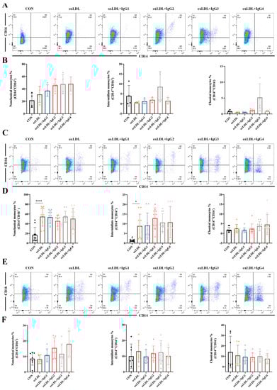 Classical monocytes comprise the majority of circulating monocytes and play a pro-inflammatory role in atherosclerosis. However, in the present study, oxLDL did not significantly promote the differentiation of CD14+ into classical monocytes in different genotypes of FcγRIIA (Figure 3). Notably, in the FcγRIIA-131H/H individuals, CVI-IgG3 induced the differentiation of classical monocytes, consistent with the results of MCP-1 (Figure 3A,B), suggesting that IgG3 yields pro-inflammatory effects. However, CVI antibodies of other subtypes yielded no obvious effect. Intermediate monocytes are considered to resemble classical monocytes but possess pro-inflammatory properties []. After 7 days of stimulation of human peripheral blood CD14+ monocytes with oxLDL, the cells were significantly polarized to intermediate monocytes in the FcγRIIA-131R/R individuals (Figure 3C,D). After the different subtypes of antibodies were treated, the oxLDL-induced increase in intermediate monocytes was not reversed. In FcγRIIA-131H/H or FcγRIIA-131H/R individuals, oxLDL and CVI antibodies had no significant effect on CD14+ differentiation into intermediate monocytes (Figure 3A,B,E,F). Non-classical monocytes, also known as alternate-activated monocytes, exert anti-inflammatory effects in vivo. Nonetheless, in the present study, oxLDL and CVI antibodies of different subtypes were ineffective against CD14+ monocyte differentiation into non-classical monocytes in individuals with different genotypes (Figure 3).