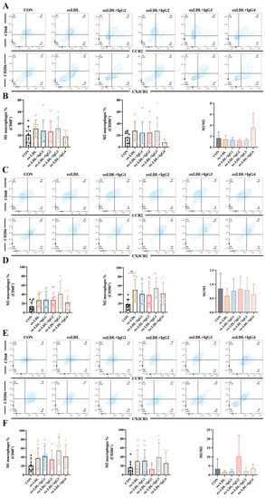 Human cells co-expressing CD68 (an LDL and lectin-binding scavenger protein) and CCR2 (MCP-1 receptor) are considered to be pro-inflammatory M1 macrophages, whereas those co-expressing CX3CR1 (specific receptor for fractalkine) and the scavenger receptor CD206 are anti-inflammatory M2 macrophages []. Based on these antigenic characteristics, M1 macrophages are more susceptible to higher MCP-1 concentrations entering vessel wall damage sites and differentiating into foam cells, whereas M2 macrophages exert scavenging activity and suppress inflammation via CD206 []. However, in vitro experiments showed increased differentiation of both M1 (CCR2+CD68+) and M2 (CX3R1+CD206+) macrophages after CD14+ monocytes in the FcγRIIA-131H/H (Figure 4A,B) and FcγRIIA-131H/R (Figure 4E,F) normal individuals were treated with oxLDL for 2 weeks, although the difference was not statistically significant. When co-incubated with oxLDL and different subtypes of antibodies for 2 weeks, all antibodies did not suppress the differentiation of inflammatory M1 macrophages or promote the differentiation of anti-inflammatory M2 macrophages. However, compared to the oxLDL-treated group, the M1/M2 ratio was increased after IgG4 treatment in the FcγRIIA-131H/H individuals. In contrast, in the FcγRIIA-131R/R normal individuals, oxLDL significantly increased differentiation of type M2 macrophages. Nevertheless, oxLDL and the different subtypes of CVI-mAb did not affect the M1/M2 ratio.