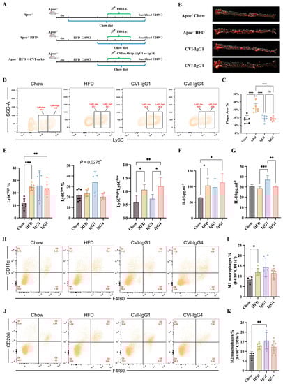 Anti-CVI-mAb adoptive transfer induced HFD-induced atherosclerotic plaque regression in Apoe−/− mice. (A) Experimental scheme for high-fat diet-fed mouse and antibody therapy strategy. (B) Aortic Oil red O staining of different groups. (C) Percentage of plaque area of the entire artery (Chow: n = 6, HFD: n = 7, IgG1: n = 6, IgG4: n = 8). (D) Flow cytometry analyzed monocytes in different groups. (E) Percentage of monocytes (Ly6Chigh and Ly6Clow) in different groups and the Ly6Chigh/Ly6Clow monocyte ratio in different groups (Chow: n = 7, HFD: n = 6, IgG1: n = 5, IgG4: n = 6). (F,G) Serum IL-1β and IL-10 levels were measured by ELISA (Chow: n = 6, HFD: n = 7, IgG1: n = 5, IgG4: n = 5). (H,J) Flow cytometry analyzed peritoneal M1 and M2 macrophages in different groups. (I,K) Percentage of M1 (F4/80+CD11c+) and M2 (F4/80+CD206+) macrophages in different groups (Chow: n = 4, HFD: n = 7, IgG1: n = 6, IgG4: n = 8). Data are expressed as mean ± SD. One-way ANOVA followed by Tukey’s multiple comparisons test, * p < 0.05, ** p < 0.01, *** p < 0.001, **** p < 0.0001.