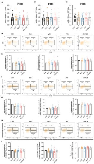 Therefore, based on the Fc segment, we treated PBMCs from atherosclerotic patients with 14 mAb (CVI-IgG1), IgG4, Fc-engineered antibodies V11, and GAALIE of wild-type CVI-IgG1. Notably, these antibodies yielded no significant effect on MCP-1 release from PBMCs in patients with different genotypes (Figure 7A–C). We also examined the differentiation of monocytes in the PBMCs. The results showed that IgG1, IgG4, V11, and GAALIE did not affect the differentiation of classical monocytes, non-classical monocytes, and intermediate monocytes when compared to the CON group (Figure 7D–I). Interestingly, FcγRIIA was expressed on many lymphocytes, including monocytes. However, the mutant GAALIE, which has a refined binding affinity for the activating receptor, did not cause alterations in monocyte differentiation, suggesting that monocyte differentiation is not associated with the FcγRIIA gene polymorphism.