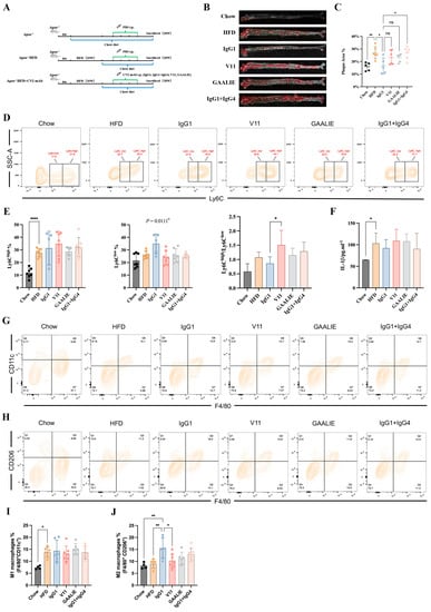 CVI-IgG1 reduced atherosclerotic plaque area in Apoe−/− mice. (A) High-fat diet-induced mouse model experimental protocol and antibody therapy strategy. (B) Aortic Oil red O staining in different groups. (C) Percentage of plaque area of the entire artery (Chow: n = 5, HFD: n = 6, IgG1: n = 5, V11: n = 6, GAALIE: n = 6, IgG1/IgG4:n = 6). (D) Flow cytometry analysis of different groups of monocyte (Chow: n = 7, HFD: n = 7, IgG1: n = 5, V11: n = 7, GAALIE: n = 7, IgG1/IgG4: n = 7). (E) Percentage of monocytes (Ly6Chigh and Ly6Clow) in different groups and ratio of Ly6Chigh/Ly6Clow in different groups. (F) Measurement of serum IL-1β levels by ELISA (Chow: n = 6, HFD: n = 7, IgG1: n = 5, V11: n = 7, GAALIE: n = 7, IgG1/IgG4:n = 7). (G,H) Flow cytometry analysis of different groups of intraperitoneal M1 and M2 macrophages (Chow: n = 4, HFD: n = 6, IgG1: n = 6, V11: n = 7, GAALIE: n = 7, IgG1/IgG4:n = 7). (I,J) Percentage of M1 (F4/80+CD11c+) and M2 (F4/80+CD206+) macrophages in different groups. Data are expressed as mean ± SD. One-way ANOVA followed by Tukey’s multiple comparisons test, * p < 0.05, ** p < 0.01, **** p < 0.0001.
