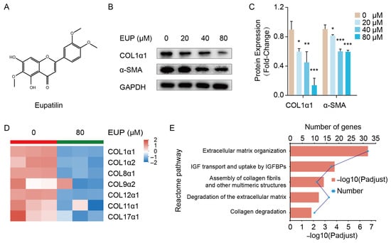 Eupatilin represses the activation of LX-2 cells. (A) Chemical structure of eupatilin. (B) Protein expression of COL1α1, α-SMA detected 48 h after eupatilin treatment by Western blotting. (C) Relative protein signal intensity was quantified as mean ± standard deviation (mean ± SD, n = 3). p values are calculated by one-way ANOVA followed by the Tukey’s test. * p < 0.05, ** p < 0.01 and *** p < 0.001 vs. 0 μM EUP group. (D) Heatmap showing expression level of collagens evaluated by transcriptome analysis (n = 3). (E) The top five reactome pathways of the DEGs in transcriptome analysis. EUP: Eupatilin; α-SMA: α-smooth muscle actin; COL1α1: Collagen type I alpha 1; COL1α2: Collagen type I alpha 2; COL8α1: Collagen type VIII alpha 1; COL9α2: Collagen type IX alpha 2; COL12α1: Collagen type XII alpha 1; COL11α1: Collagen type XI alpha 1; COL17α1: Collagen type X VII alpha 1; GAPDH: Glyceraldehyde-3-phosphate dehydrogenase.