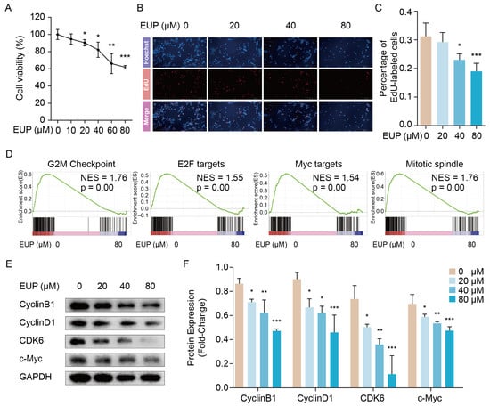 Eupatilin inhibits the proliferation of LX-2 cells. (A) Cell viability of LX-2 cells treated with different eupatilin concentrations. (B) The effect of eupatilin on DNA replication of LX-2 cells investigated by EdU staining. (C) The percentage of EdU-labelled cells is plotted (mean ± SD, n = 4). (D) GSEA enrichment plots showed four proliferation-related gene sets were down-regulated in eupatilin exposed LX-2 cells. (E) The protein levels of CyclinB1, CyclinD1, CDK6, and c-Myc detected 48 h after eupatilin treatment using Western blotting. (F) Relative protein signal intensity was quantified as mean ± standard deviation (mean ± SD, n = 3). p values are calculated by one-way ANOVA followed by the Tukey’s test. * p < 0.05, ** p < 0.01 and *** p < 0.001 vs. 0 μM EUP group. EUP: Eupatilin; GSEA: Gene set enrichment analysis; CDK6: Cyclin dependent kinase 6; GAPDH: Glyceraldehyde-3-phosphate dehydrogenase.