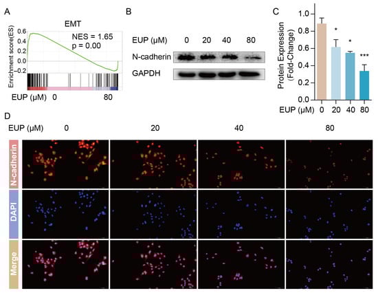 Eupatilin down-regulated genes of EMT process in LX-2 cells. (A) Enrichment plot of EMT gene set. (B) The expression of N-cadherin protein detected 48 h after eupatilin treatment by Western blotting. (C) Relative protein signal intensity was quantified as mean ± standard deviation (mean ± SD, n = 3). p values are calculated by one-way ANOVA followed by the Tukey’s test. * p < 0.05 and *** p < 0.001 vs. 0 μM EUP group. (D) Immunofluorescence staining for N-cadherin (red) in LX-2 cells. Nuclei were counter-stained with DAPI (blue). EUP: Eupatilin; EMT: Epithelial–mesenchymal transition; GAPDH: Glyceraldehyde-3-phosphate dehydrogenase; DAPI: 4′,6-diamidino-2-phenylindole.
