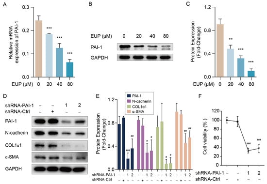 To uncover the molecular mechanisms of eupatilin-induced EMT inhibition, the intersection between EMT-related genes and DEGs in the transcriptome data was analysed. Among these common genes, PAI-1 attracted our attention. Previous studies have shown that PAI-1 is strongly associated with EMT and fibrosis [,]. Excessive PAI-1 level inhibits the activation of the ECM degradation enzymes, thereby weakening ECM degradation []. Nevertheless, after treatment with eupatilin, the relative mRNA level of PAI-1 was dramatically down-regulated in a dose-dependent manner (Figure 4A), and the same was true for the protein expression of PAI-1 (Figure 4B,C). To further investigate the function of PAI-1 in EMT in LX-2 cells, we constructed shRNAs targeting PAI-1. As expected, the protein level of PAI-1 was significantly decreased by shRNA1 or shRNA2 compared with that in the negative control group (Figure 4D,E). Additionally, the protein levels of N-cadherin, COL1α1, and α-SMA were impaired by PAI-1 shRNAs (Figure 4D,E). CCK-8 analysis further indicated that the knockdown of PAI-1 reduced LX-2 cell viability (Figure 4F). In summary, these findings suggest that eupatilin can modulate EMT and HSC activation by inhibiting PAI-1 expression.