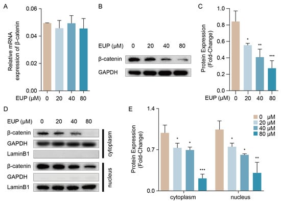 It is widely known that β-catenin is the crucial transcriptional regulator of PAI-1 [], and stabilized β-catenin can enter the nucleus and activate the transcription of target genes via binding the TCF/LEF family proteins. In addition, the β-catenin signalling pathway plays a crucial role in EMT []. As a result, qRT-PCR and Western blotting were used to detect the expression of β-catenin in eupatilin-treated HSCs. As shown in Figure 5A, eupatilin did not affect the mRNA expression of β-catenin. However, as the concentration of eupatilin increased, β-catenin protein expression decreased (Figure 5B,C). Next, we detected the β-catenin protein level in the nucleus and the cytoplasm. We observed that the levels of β-catenin protein in both the nucleus and cytoplasm decreased (Figure 5D,E). In summary, these results suggest that eupatilin can inactivate the β-catenin signalling pathway to slow down the EMT progression of HSCs in hepatic fibrosis.