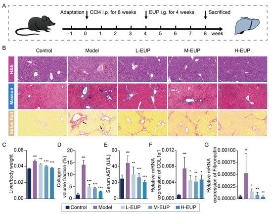 Eupatilin alleviates hepatic fibrosis in CCl4-induced mouse models. (A) The scheme of animal experiments in present study. The grouping was as follows: Control; Model (CCl4, without EUP treatment); L-EUP (CCl4, 10 mg/kg EUP); M-EUP (CCl4, 20 mg/kg EUP); H-EUP (CCl4, 40 mg/kg EUP). (B) Representative images of livers stained with H&E, Masson, and Sirius red (Red arrows represent mononuclear cell infiltration, black arrows represent collagen deposition. Scale bars = 50 μm). (C) The ratios of liver weight to body weight in different groups (mean ± SD, n = 6). (D) Analysis of collagen volume fraction of Masson staining. (E) Serum levels of AST in CCl4-induced mice (mean ± SD, n = 6). (F,G) Relative mRNA expression of COL1α1 and Fibronectin in liver tissues (mean ± SD, n = 6). ## p < 0.01 and ### p < 0.001 vs. control group. * p < 0.05, ** p < 0.01 and *** p < 0.001 vs. model group. p values are calculated by one-way ANOVA followed by the Tukey’s test. CCl4: Carbon tetrachloride; i.p.: Intraperitoneal; i.g.: Intragastrical; EUP: Eupatilin; H&E: Hematoxylin and eosin; L-EUP: Low-dose eupatilin; M-EUP: Middle-dose eupatilin; H-EUP: High-dose eupatilin; AST: Aspartate aminotransferase; COL1α1: Collagen type I alpha 1.