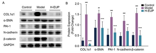 Eupatilin inhibits expression of COL1α1, α-SMA, PAI-1, N-cadherin, and β-catenin in the liver tissues of model group treated with the high-dose eupatilin. (A) Western blot analysis of COL1α1, α-SMA, PAI-1, N-cadherin and β-catenin in CCl4-induced mice liver tissues treated with eupatilin (40 mg/kg). (B) Relative protein signal intensity was quantified as mean ± standard deviation (mean ± SD, n = 6). ## p < 0.01 and ### p < 0.001 vs. control group. ** p < 0.01 and *** p < 0.001 vs. model group. p values are calculated by one-way ANOVA followed by the Tukey’s test. H-EUP: High-dose eupatilin; COL1α1: Collagen type I alpha 1; α-SMA: α-smooth muscle actin; PAI-1: Plasminogen activator inhibitor-1; GAPDH: Glyceraldehyde-3-phosphate dehydrogenase; EMT: Epithelial–mesenchymal transition; ECM: Extracellular matrix.