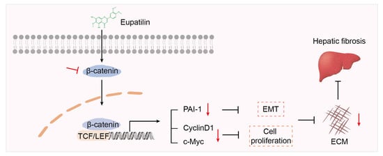 Furthermore, we established a CCl4-induced hepatic fibrosis mouse model to demonstrate the anti-hepatic fibrosis effect of eupatilin. Additionally, we explored the underlying mechanism of eupatilin-induced HSC deactivation. Through a series of in vivo and in vitro experiments, it can be concluded that eupatilin significantly relieved hepatic fibrosis and HSC activation by inhibiting the EMT process and proliferation of HSCs via down-regulating the mRNA levels of downstream targets of the β-catenin pathway, including PAI-1, cyclinD1, and c-Myc (Figure 8). Our study provides novel insights into the potential of eupatilin as an anti-liver fibrosis agent.