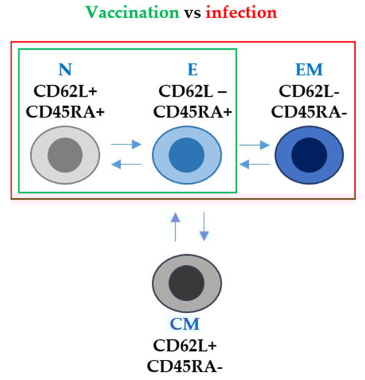 - Mahnke, Y.D.; Brodie, T.M.; Sallusto, F.; Roederer, M.; Lugli, E. The who’s who of T-cell differentiation: Human memory T-cell subsets. Eur. J. Immunol. 2013, 43, 2797–2809. [Google Scholar] [CrossRef]