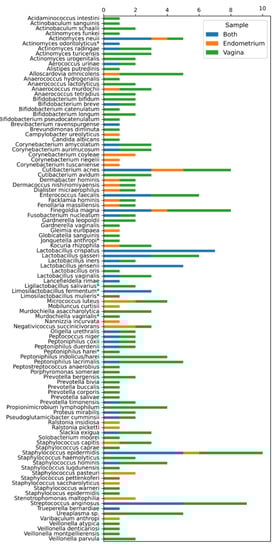 To our knowledge, all the previous sequence-based studies describe a greater diversity of species in the endometrium than in the vagina []. It has been suggested that the lower pH in the vagina, compared to the endometrium, harbors a less-favorable niche for most microorganisms []. In contrast to previous literature, we identified, in all patients, a higher number of species in the vagina compared to the endometrium. This observation was found to be statistically significant (p = 0.002). These discordant results could be explained by the higher influence of DNA/RNA contamination in the endometrial sequence-based datasets. The introduction of contaminating microbial DNA during sample preparation originating from molecular biology grade water, PCR reagents, and DNA extraction kits may swamp the low amount of starting material and generate misleading results. This type of contamination is a concern for both targeted approaches using PCR, and shotgun approaches without the use of PCR [,]. A richer vaginal microbiome also seems logical, as the endometrium is less directly exposed to microorganisms compared to the vagina. Despite vagino-uterine contractions leading sperm (and possibly microorganisms too) to the upper genital tract, medicinal manipulations, and hematological spread might cause an influx of microorganisms seeding the endometrium; the endometrium is, anatomically, fairly isolated compared to the vagina, which is in direct contact with the environment [,,].