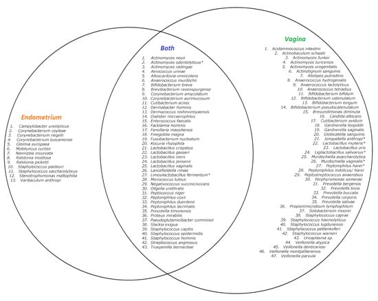 Venn diagram of described species in the 10 samples with culturomics. Left circle: species only found in the endometrium. Right circle: species only found in the vagina. Inner circle: species found in both the vagina and endometrium. * Species identified using 16S rRNA sequencing.