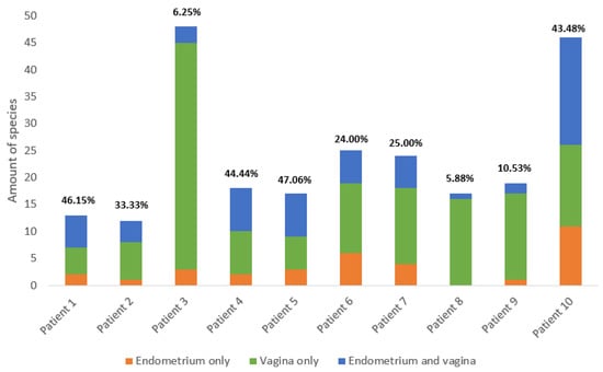 Summary of the number of species in the vagina and endometrium across all 10 patients. The proportion of species identified only in the endometrium is colored orange, the proportion identified only in the vagina is colored green, and the proportion identified in both vagina and endometrium is colored blue. The concordance ((species found in both vagina and endometrium/all species found) * 100) of species between the vaginal and endometrial microbiota is given above the corresponding bars. Detailed information per patient is available in the Supplementary Materials.